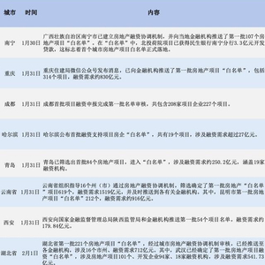 此外,在目前公布白名单的城市中,重庆公布的地产项目达到300个以上。据重庆住建局微信公众号发布消息,已向金融机构推送了第一批房地产项目“白名单”,包括314个项目,融资需求约830亿元。成都、昆明的“白名单”地产项目也在200个以上。