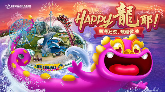 内容:举办海洋公园happy龙耶—南海狂欢新春嘉年主要亮点为首创南海秘境哪吒闹海水下大秀;联名国内原创ip-“happy龙”搞怪又可爱的巨型龙龙们现身海洋欢乐世界;好彩龙大巡游;钢花火龙配合凤凰飞天,别开生面的非遗秀;龙年限定版无人机烟花秀。