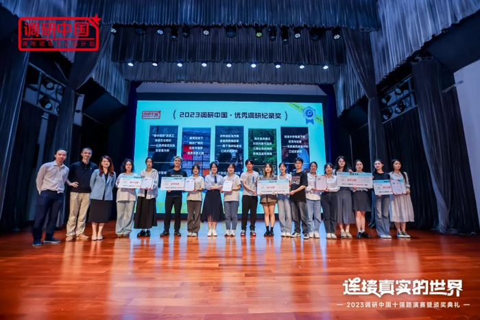 2023调研中国颁奖典礼现场,获得「优秀调研纪录奖」的学生团队代表及颁奖嘉宾合影