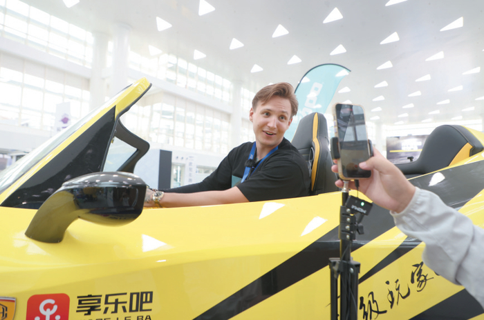 俄罗斯网红博主大明在2023年三亚国际游艇展暨国际酒类展现场体验“海上法拉利”运动快艇。(资料照片)