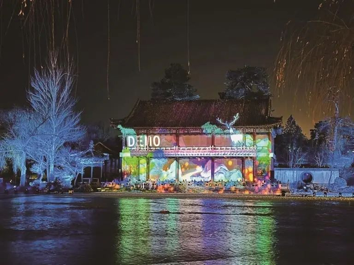 游客从德汇门进入园区,经由清音阁、晴碧亭、万壑松风、水流云在等景点,最后进入万树园灯会核心区,由万树园门出园,夜游动线全程步行约1公里。灯展共包括“承天之德、古韵迎祥、烟雨夜画、吟咏流觞、祥龙纳福、张灯结彩、林苑幻境、万象祈福、天鹿永昌”九大主题,形成一条“移步易景,惊喜连连”的光影体验游线,并在万树园区域重点打造了“张灯结彩”“烟雨夜画”“祥龙纳福”三张核心夜游名片。