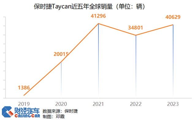 除了2022年受供应链影响有所回落外,保时捷Taycan的销量一直稳步增长。2019年,保时捷Taycan的全球销量为1386辆(当年销量非完整年)。5年后,这个数字扩大了20倍以上:2023年,保时捷Taycan销量40629辆,同比增长17%。