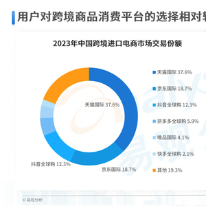 报告显示,2023年中国跨境进口电商整体市场规模为5517.7亿元,同比增长4.6%。交易份额排名前三的进口零售电商分别是天猫国际(37.6%),京东国际(18.7%),抖音全球购(12.3%)。易观认为,消费者对进口电商的平台选择较为集中。