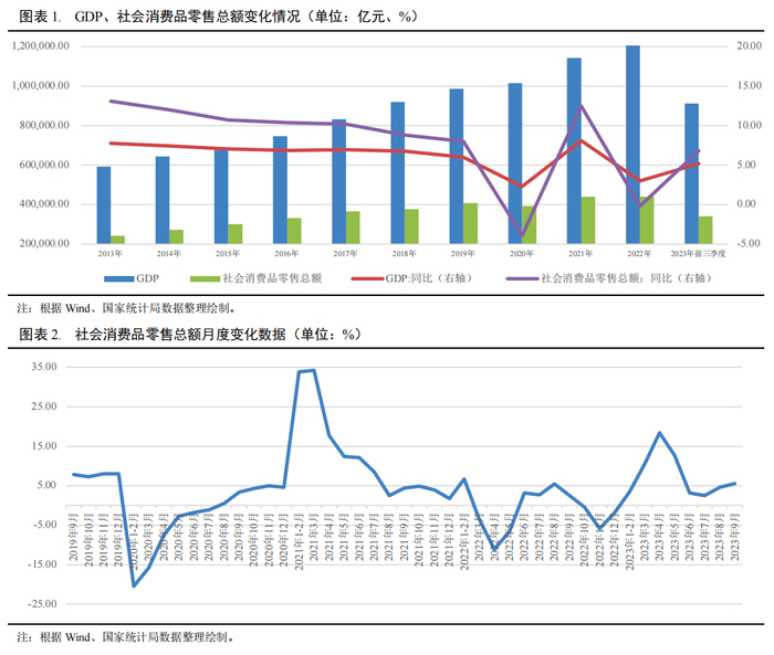 2023年以来,国内经济仍面临着来自外部风险挑战和国内多重因素交织叠加带来的压力,但经济发展恢复常态且总体回升的态势较为明确,前三季度完成国内生产总值913,027亿元,按不变价格计算,同比增长5.2%。从环比增速来看,三季度环比增长1.3%,比二季度加快0.8个百分点,增长持续恢复向好。消费市场方面,政府对于消费领域的扶持力度持续较大。商务部将2023年确定为“消费提振年”,牵头组织开展了迎春消费季、全国消费促进月、绿色消费季、国际消费季等主题活动,以及老字号嘉年华、双品网购节等多个重点活动。同时,地方上也结合本地特色开展形式多样的消费促进活动,诸如上海的“五五购物节”,北京、天津、河北三地联动的“京津冀消费季”,重庆的“爱尚重庆”,广西的“三三消费节”等。伴随着促消费政策的发力,国内消费市场呈现持续恢复态势。2023年前三季度,社会消费品零售总额为342,107亿元,同比增长6.8%;扣除价格因素,实际增长6.6%。2023年前三季度最终消费支出对经济增长的贡献率为83.2%,拉动GDP增长4.4个百分点;其中三季度,由于消费持续回升,出口下行,投资增速回落,最终消费支出对经济增长贡献率进一步达到94.8%,最终消费支出拉动经济增长4.6个百分点。消费仍是国内经济增长的核心动力。