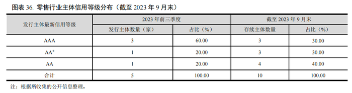 截至2023年9月末,零售业仍在公开市场有存续期一般债券的主体共计12家,其中国美电器有限公司(简称“国美电器”)和步步高投资集团股份有限公司(简称“步步高集团”)存续期内分别有3支债券(为“18国美01”、“19国美01”、“20国美01”)和1支债券(为“22步步高MTN001”)。其中,因国美电器无法全面准确提供后续跟踪评级相关资料以及按期支付后续评级用费,已于2023年2月20日终止评级,其最后一次主体评级等级为BBB+/负面,评级时间为2022年12月21日。步步高集团“22步步高MTN001”未进行主体评级,其最后一次主体评级等级AA-/负面,评级时间为2023年2月20日[20]。除上述两家企业外,剩余10家存续期内发债企业的最新主体级别分布在AA级到AAA级,评级展望均为稳定。