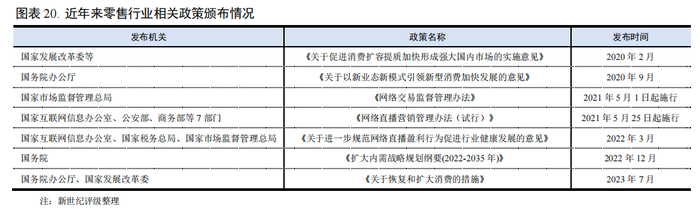 在鼓励消费的同时,政府也在不断规范消费市场行为。2021-2022年,多部委颁布实施了《网络直播营销管理办法(试行)》《网络交易监督管理办法》等法律法规,压实平台主体责任,规范市场交易行为。税务部门也持续强化对电商直播行业偷逃税问题的监管和处罚。2022年3月,国家互联网信息办公室、国家税务总局、国家市场监督管理总局三部门联合印发《关于进一步规范网络直播盈利行为促进行业健康发展的意见》,针对网络直播行业存在的偷逃缴纳税款、带货营销不规范等问题出台相关举措,推动行业规范发展。