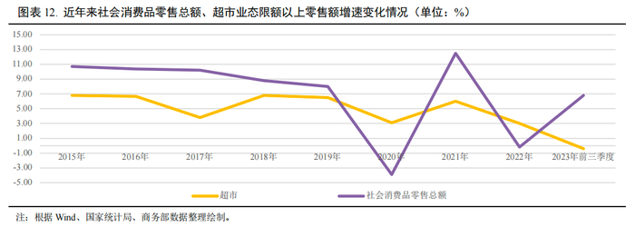 2023年前三季度,主要受渠道竞争加剧等影响,超市行业零售额仍出现下降。超市行业当期处于调整阶段,门店调整力度较大,短期内运行改善预期相对偏弱。
