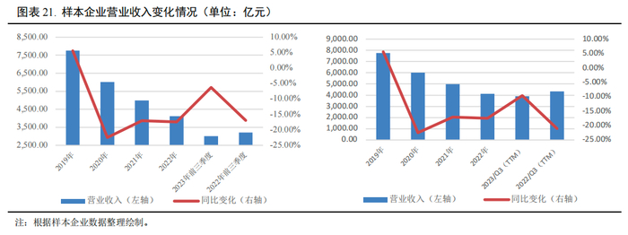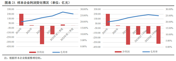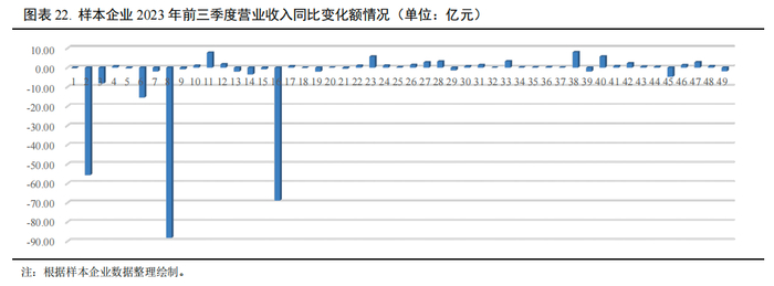 具体来看,49家样本企业中有19家企业2023年前三季度营业收入同比出现下滑,30家企业同比实现增长,由于个别企业收入同比降幅较大,导致了整体样本收入仍呈现同比下降状态。