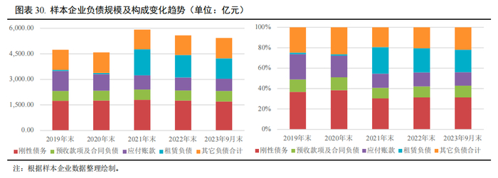从债务构成来看,样本零售企业近年来的负债以应付账款、预收款项及合同负债、刚性债务和租赁负债为主,合计占负债总额的比重维持在70-80%左右。其中,受主业规模变动影响,近年来应付账款规模有所缩减;同时,零售企业具备商业预付卡的发行能力,预收款项及合同负债规模总体稳中有增;此外,新租赁准则全面执行后2021年以来新增了大量的租赁负债。截至2023年9月末,样本企业应付账款余额合计为710.94亿元,较2022年末小幅减少6.36%,主要为应付供应商货款等;预收款项及合同负债余额合计为617.37亿元,较2022年末略增2.57%,主要包括预付卡预收款、预收货款及预收租金等;租赁负债为1,202亿元,较2022年末减少9.09%。