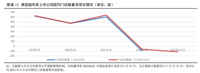 随着我国超市行业的多年发展,整体已进入规模化、连锁化发展阶段。近年来受市场竞争等因素影响,实体超市运行承压,超市行业整体拓展速度呈现放缓态势,且经营调整力度加大。根据中国连锁经营协会《连锁超市经营情况报告(2022年)》,2021年Top100超市企业门店总数28,502个,同比增长2.9%,门店增速均明显低于2019年(6.6%)和2020年(7.4%)。根据中国连锁经营协会2023年6月发布的《2022年中国超市Top100》,2022年Top100超市企业门店总数为28,413个。从典型超市类上市公司[7]可比数据来看,2019-2021年相关企业在国内门店数量总体维持净增加,至2022年和2023年上半年则已呈现净减少趋势,超市企业短期内经营调整力度较大,关店量增加。
