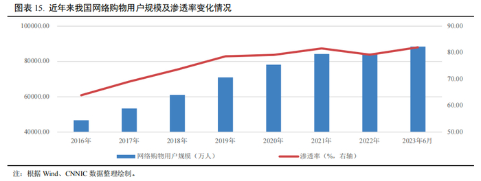 电商行业发展依赖于线上流量的持续供给。流量端来看,随着国内互联用户数量的增长,以及近年来在外部扰动因素影响下居民线上消费习惯的培养,我国网络购物用户规模仍在不断扩大。根据中国互联网络信息中心(CNNIC)数据显示,截至2023年6月末我国网络购物用户数达到8.84亿,较2022年末增长3,880万人,已占到全体网民的82%。2020年以来在外部扰动因素的影响下,线下消费阶段性受阻,居民消费路径进一步向线上转移,线上消费辐射的年龄层和地区进一步扩大,加之线上线下融合下促生的新零售模式/业态的发展,使得线上零售持续受益。但同时也需关注到随着国内互联网人口流量红利的逐步见顶,线上消费领域新增流量增速呈现放缓态势,电商平台对于存量用户的竞争及维系日益重要。