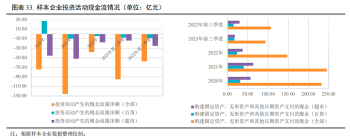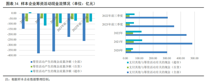 投资活动现金流方面,零售企业持续存在门店新增/调改方面所形成的资本性支出需求,但趋于弱化。近年来随着消费市场需求及竞争环境的变化,零售企业扩张相对谨慎且总体放缓,相应在“购建固定资产、无形资产和其他长期资产支付的现金”方面的支出需求有所缩减。2023年前三季度,全部样本企业“购建固定资产、无形资产和其他长期资产支付的现金”同比减少12.79%。同时,样本企业投资性现金流量净额还受到理财收支、股权等资产购置/处置等影响。2023年前三季度,全部样本企业投资性现金流量净额为-94.97亿元,较上年同期净流出额增加37.65亿元,主要是居然之家实施大额股权收购项目、重庆百货在关联方马上消费金融的股东存款增加等导致其当期投资性现金净流出规模均出现增加。