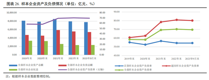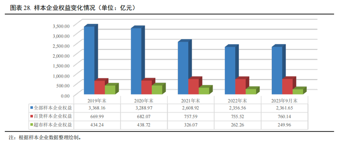 权益方面,2020-2022年末和2023年9月末全部样本企业所有者权益分别为3,288.97亿元、2,608.92亿元、2,356.56亿元和2,361.65亿元;同期末未分配利润分别为1,117.93亿元、542.45亿元、285.47亿元和271.20亿元。受执行新租赁准则并一次性调减前期未分配利润,以及经营承压,2021年以来超市经营企业持续大额亏损等因素综合影响,样本企业权益规模下滑明显。细分业态来看,超市行业样本企业所受影响更大,权益规模从2020年末的438.72亿元降至2023年9月末的249.96亿元;百货行业样本企业权益规模则相对持稳。