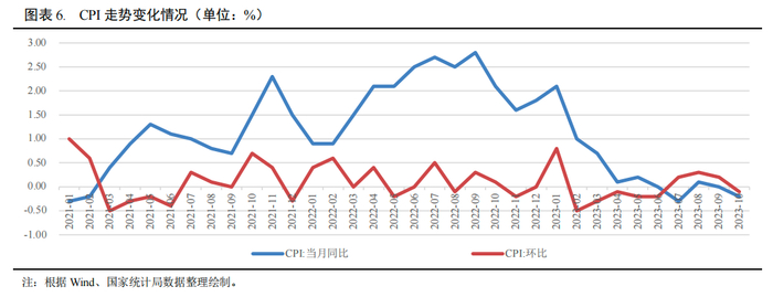价格方面,2023年前三季度全国CPI比上年同期上涨0.4%,涨幅温和。分月看,CPI同比呈现前高后低态势。1月,受春节效应等因素影响,CPI同比上涨2.1%;2月,节后消费需求回落叠加春节错月因素,同比涨幅回落至1.0%;3-6月,国际能源价格持续回落,国内消费市场供应充足,CPI同比涨势逐月回落,6月由涨转平;7-9月,受国际能源价格上行、暑期旅游出行增加等因素影响,CPI环比连续3个月上涨,但由于上年同期基数较高,同比延续平稳态势。分类来看,2023年前三季度,食品价格同比上涨0.9%,影响CPI上涨约0.16个百分点;非食品价格涨幅稳定,同比上涨0.3%,影响CPI上涨约0.25个百分点。