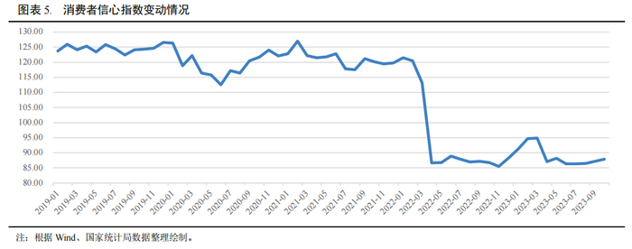 同时也需关注到,尽管2023年以来国内消费市场呈现稳定恢复态势,但当前居民消费信心仍然有待进一步提振。从近年来消费者信心指数来看,2020年公卫因素影响下消费者信心指数一度跌至6月的年度最低点112.6,至2022年2月消费者信心指数恢复至120.5,3月以后受公卫因素反复对经济及消费市场的冲击加大的影响,消费者信心较为疲软,4-12月消费者信心指数跌至并徘徊在90以下的水平,处于近年来低位。2023年以来,一季度消费者信心指数回升至90以上,但4-9月又回落至80-90的区间水平。当前来看居民消费信心仍有所不足,消费潜力仍有进一步释放空间。