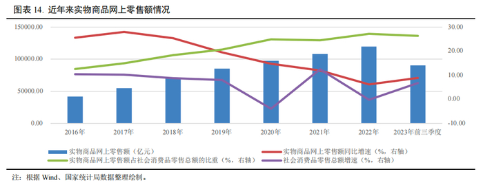 随着电商行业的持续发展,国内网上零售额保持着较快增长态势,近年来增速虽总体有所放缓,但仍高于社零总额增速。国家统计局数据显示,2023年1-9月全国网上零售额10.8万亿元,同比增长11.6%,高于社会消费品零售总额增速4.8个百分点。其中实物商品网上零售额9.04万亿元,同比增长8.9%,占社零总额的比重为26.4%,对社零增长的贡献率达到33.9%。网络零售拉动消费效应较为显著。