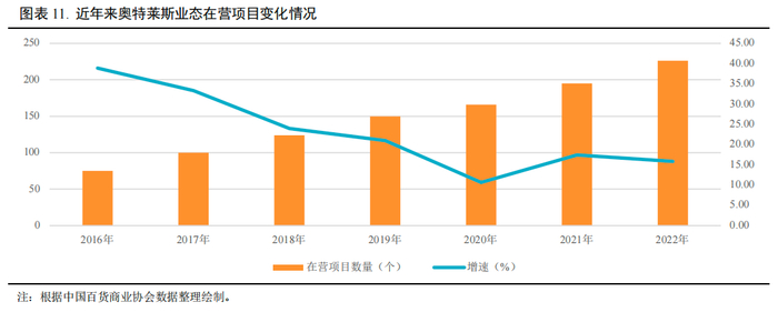 总体来看,尽管当前外部扰动因素对行业运行的压力已减弱,但百货业仍然面临着居民消费偏好变化及消费增速不达预期、线上零售持续分流等多重压力。同时,近年来百货行业内部发展状况也存在一定分化,其中传统百货店由于主要聚焦于百货类商品零售,面临的竞争及分流压力尤其明显,业内经营重点在于存量门店的调改及提质增效,进一步外拓的动力相对不足。购物中心业态同样受外部扰动因素的干扰及持续分流影响,但由于其所具备的服务类及体验类消费特点难以为线上零售所取代,仍是传统百货转型发展的重点方向。奥特莱斯作为主要销售名牌过季、下架、断码商品的业态,则较好地满足了消费分层所带来的客群需求,近年来仍展现出了相对较好的发展态势。