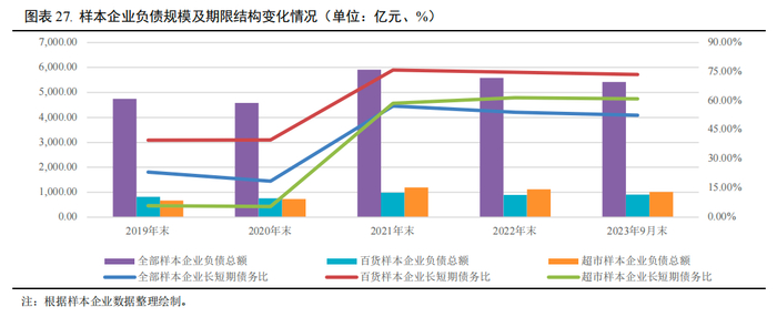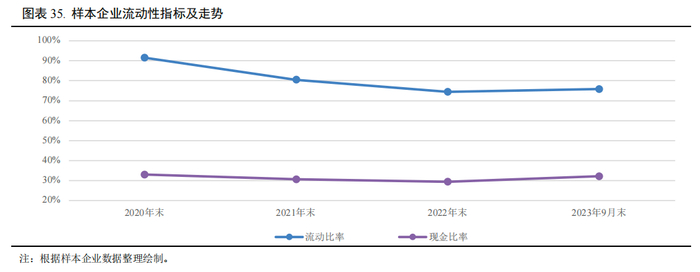 受运营调整及规模总体缩减等影响,2023年前三季度零售行业样本企业债务规模整体有所减少,财务杠杆稳中略降;受执行新租赁准则影响,行业负债率整体仍处于较高水平,且债务期限结构趋于短期化;当期现金流表现总体仍较好,在外部环境影响下门店扩张放缓,资本性支出需求有所减弱;行业整体即期付现能力仍较好,但个别样本企业流动性风险仍有待化解。