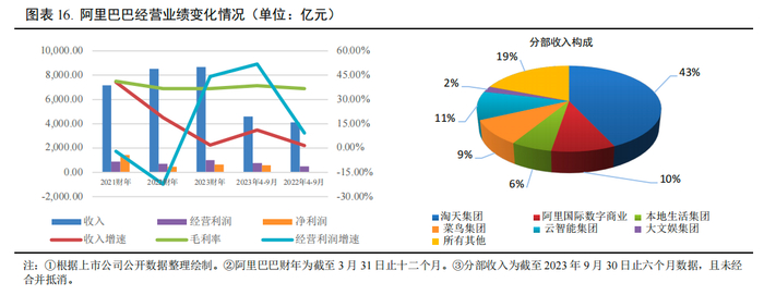 根据其2023年12月公告的《2024财务年度中期报告》,截至2023年9月30日止六个月,阿里巴巴实现收入4,589.46亿元,同比增长11.20%,增速同比有所加快,但相较21、22财年仍有所放缓。分部数据来看,核心主体淘天集团实现收入2,126.07亿元,同比增长8.33%。从模式上来看,淘天集团业务收入主要来自两部分:①中国零售商业收入,主要包括客户管理收入、直营及其他收入。其中,客户管理收入为该板块核心收入来源,主要包括淘宝/天猫平台提供P4P营销服务[14]、信息流推广营销服务等各类服务所收取的费用、交易佣金[15]等;直营及其他收入主要来自天猫超市、天猫国际以及其他直营业务。②中国批发商业收入,主要来自1688.com平台的会员费、增值服务及客户管理服务。截至2023年9月30日止六个月,中国零售商业收入/中国批发商业收入在淘天集团收入中的占比分别为95.19%(客户管理收入/直营及其他收入各占69.76%和25.43%)和4.81%。零售端,除淘天集团外,阿里巴巴还通过下属盒马、高鑫零售、银泰等企业构筑线上线下一体化、多业态的国内零售服务网络,并通过Lazada、速卖通、Trendyol等平台开展国际业务。截至2023年9月30日止六个月,阿里国际数字商业集团收入/所有其他收入[16]分别为466.34亿元和938.50亿元,同比分别增长46.80%和0.40%。同期,阿里巴巴毛利率为38.55%,同比上升1.76个百分点;实现经营利润/净利润分别为760.74亿元和596.96亿元,其中经营利润同比增加51.90%,净利润同比扭亏为盈。阿里巴巴近年来利润表现波动较明显,主要系受商誉减值损失、所持上市公司股权投资公允价值变动等因素影响。