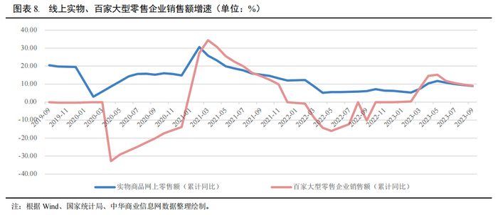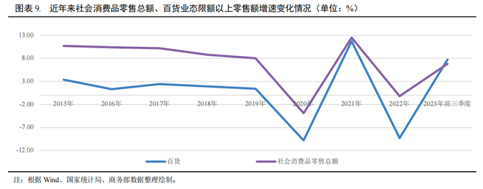 2023年以来,得益于消费市场及消费场景复苏、同期基数较低,前三季度百货业销售增速略高于社会消费品零售总额增速表现。但百货业仍面临着居民消费偏好变化及消费增速不达预期、线上零售持续分流等多重外部压力。百货业在业态及经营调改、客流维系等方面存在持续提升需求。