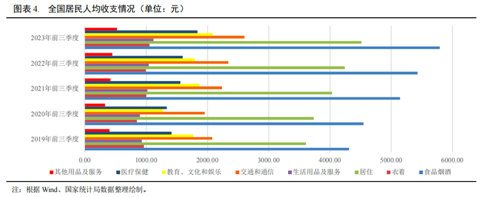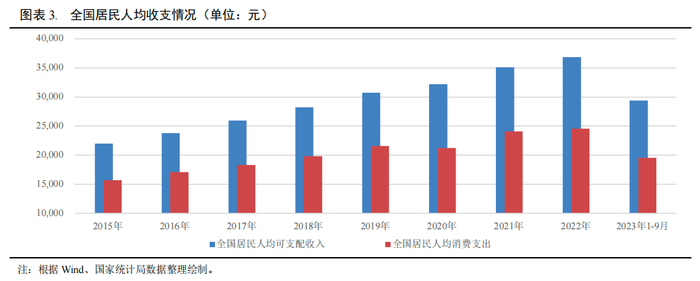 2023年前三季度,全国居民收入保持稳步增长。同时随着消费场景不断拓展,消费需求稳步回暖,同期居民消费支出继续恢复,其中服务性消费支出呈现较快增长,消费领域价格总体平稳。但需关注到当前居民消费信心仍整体偏弱。