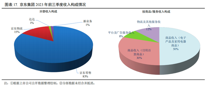 京东集团成立以来致力于发展自营模式零售业务及建立自有物流基础设施,同时随着电商平台业务、全渠道布局等的不断推进,目前京东集团收入板块主要包括京东零售、京东物流、达达及新业务等。其中京东零售(包括京东健康及京东工业等)主要从事国内的自营业务、平台业务及广告服务;京东物流业务涉及集团内部及外部物流业务;达达是国内本地实时配送及零售平台;新业务板块主要包括京东产发、京喜及海外业务。根据京东集团《2023年第三季度业绩公告》,2023年前三季度京东零售在合并抵消前收入中的占比约为83%,为其核心收入来源。京东集团零售板块主要经营在线零售和电商平台业务。其中,在线零售业务方面,京东集团采用自营模式,从供货商处采购产品,然后直接销售给客户,提供包括数码产品、家用电器、日用品等种类繁多的消费品类,为京东集团最主要的收入来源;电商平台业务方面,第三方商家通过京东集团的电商平台向顾客提供产品,并向京东集团支付销售佣金等。