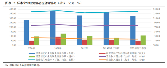 从现金流表现看,近年来零售样本企业年度间经营活动现金流量净额波动较大,2020-2022年和2023年前三季度分别为281.81亿元、381.24亿元、330.19亿元和371.41亿元,2023年前三季度随着运营的逐步恢复,经营环节现金流量总体改善,净流量同比增加13.90%。分业态来看,经营环节现金流表现与经营表现基本同步存在,其中百货样本企业2023年前三季度经营活动现金流量净额同比增加26.13%,而超市样本企业同比减少23.37%。从主业收现情况来看,零售企业收现能力强,营业收入现金率总体处于良好水平,其中百货行业受业务联营模式占比较高影响,随着新收入准则的执行,营业收入现金率持续高于行业平均水平。