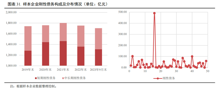 刚性债务[18]方面,近年来样本企业刚性债务规模变化较小,2019-2021年呈逐步增长,其后持续下降,截至2023年9月末余额合计为1,704.36亿元,较2022年末减少2.85%。样本企业刚性债务在期限结构上偏短期化,2023年9月末短期刚性债务占比为76.85%,存在一定的即期偿付压力。从49家样本企业刚性债务分布来看,同期末基本分布在100亿元以内的区间。