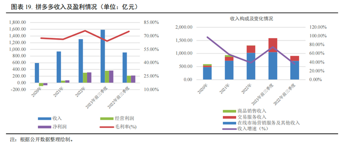 拼多多近年来收入主要来自在线市场营销服务、交易服务等。①在线市场营销服务,即拼多多向商户提供平台上搜索结果或浏览结果展示位,具体展示位置和价格需要通过平台在线竞价系统确认。拼多多在线营销服务收入取决于平台上商家根据自身不同的营销需求所做出的决定。②交易服务,拼多多针对商家通过平台进行的交易收取相关费用,费率不固定,可能会因所售商品的类别、卖家的交易表现以及消费场景等多种因素而存在差异。此外,拼多多前期也开展过一定规模的自营业务,2022年以来已缩减了这方面的业务。