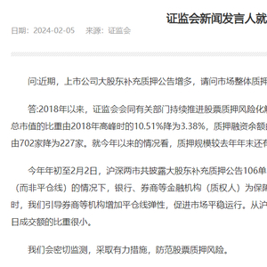证监会表示,会密切监测,采取有力措施,防范股票质押风险。