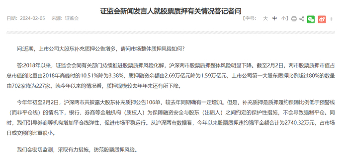 证监会指出,就今年以来的情况看,质押规模较去年年末还有所下降。