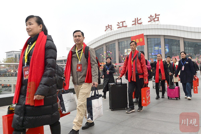“大家一路辛苦了!欢迎回家过年!”2月2日17时02分,由广州南至内江北的G3714次列车准时抵达内江北站。80名在广东务工的内江籍返乡农民工走出车厢,迎接他们的是满脸笑容和亲切的问候。