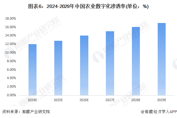 目前,我国农业数字化率远低于第二产业和第三产业。前瞻初步估计2023年中国农业数字化渗透率或达到11.2%。随着农业数字化水平的提高,机器人、物联网、人工智能等先进技术被不断应用到农业生产经营的各个环节,未来农业数字化的需求将不断攀升。预计2029年中国农业数字化渗透率将会达到17%。