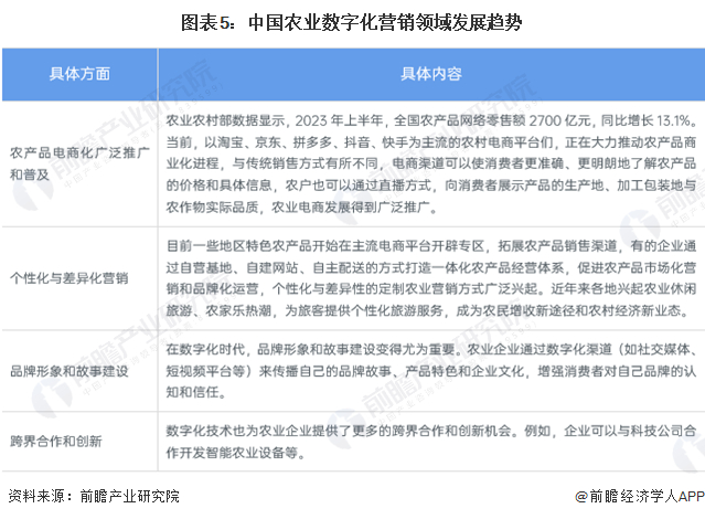 在“数商兴农”政策的支持下,中国电商加快了“下乡”步伐,从初期的销售端网络化,逐渐向流通端、生产端的数字化、智能化推进。农业农村部数据显示,2023年上半年,全国农产品网络零售额2700亿元,同比增长13.1%。此外,近年来各地兴起农业休闲旅游、农家乐热潮,为旅客提供个性化旅游服务,成为农民增收新途径和农村经济新业态,个性化与差异化营销成为中国农业数字化的一大亮点。未来,中国传统农业企业还可通过品牌形象和故事建设、跨界合作和创新,推进农业数字化建设进程。