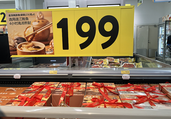 这时距离2024年的除夕夜还有不到一周的时间,在这个冷柜前消费者把接近2公斤的佛跳墙礼盒放进购物车——为了让更多购物者可以“挤”进货架,山姆甚至取消了该区域附近的试吃摊位。