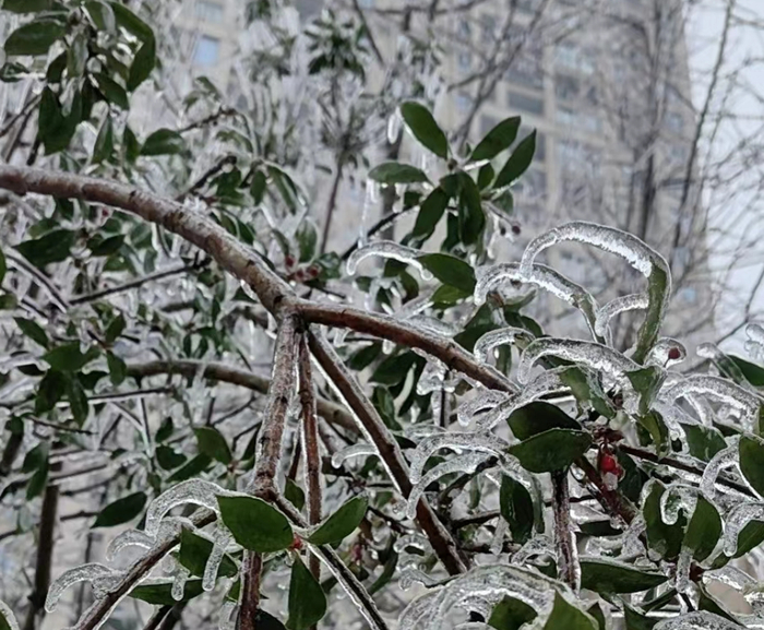 街面上不少树的枝条像镀了一层琉璃,很漂亮,外形像东北的雾凇。