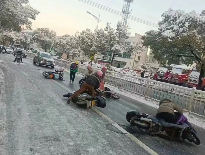 只要冻雨仍在下,路面就一直处在结冰打滑的风险中,人走路都不稳。