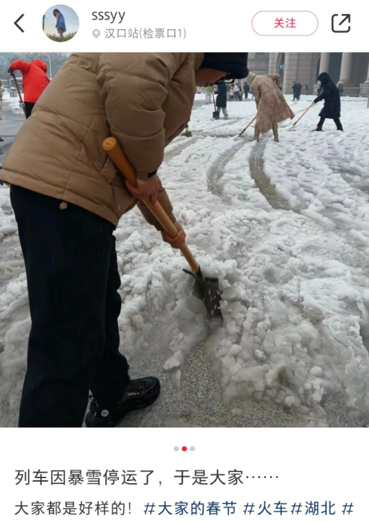汉口站由于线路结冰部分列车停运,一些滞留的热心旅客索性加入了除冰队伍,帮忙给火车站周边铲雪。