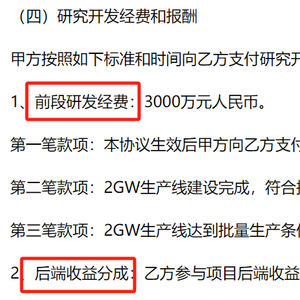 根据公告,在研发环节,高乐股份将向尼古拉研究院分三个阶段支付研究开发经费,包括协议生效后;2GW生产线建设完成,符合技术参数并运转正常后;以及2GW生产线达到批量生产条件后,前者分别向后者支付1000万元,共计3000万元。