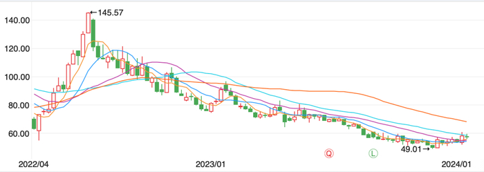 至于天齐锂业,一年半以来,其股价从145.57元每股,跌到2024年1月19日的57.28元每股。这让30万户股民颇为煎熬,宋思就是其中一个。他在这期间有过补仓,但都被闷杀,“都跌麻了。”宋思向「市界」抱怨道。蒋卫平的身家,也从2021年的660亿元,缩水到2023年的325亿元,一年多时间没了335亿元。