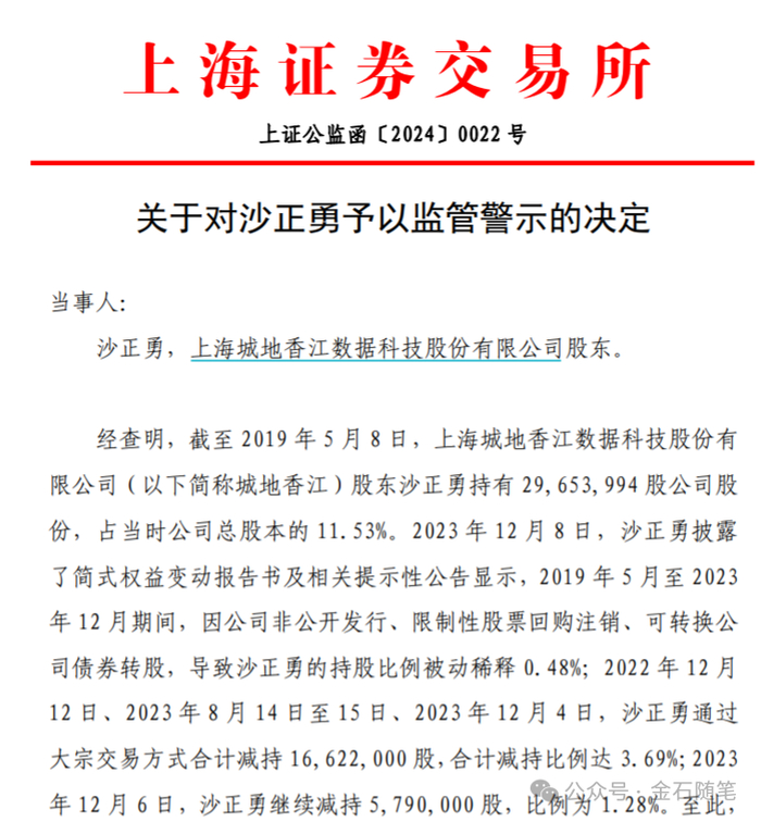 网友以及财经博主们纷纷吐槽,城地香江第二大股东沙正勇违规套现1.5亿,被上交所予以监管警示!不痛不痒的监管警示警告,公开谴责都没有…