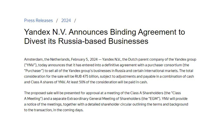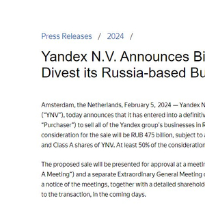 Yandex N.V.董事长John Boynton在一份声明中表示,这笔交易“将使股东能够为我们正在剥离的业务恢复一些价值”,并为集团保留的国际业务提供新的增长潜力。