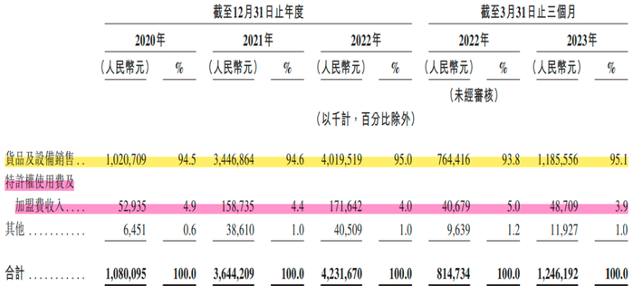 招股书显示,茶百道约95%以上的收入,来自于向加盟店销售货品及设备,包括销售乳制品、茶叶、水果等制作茶饮的材料及配料,以及包材和门店设备。