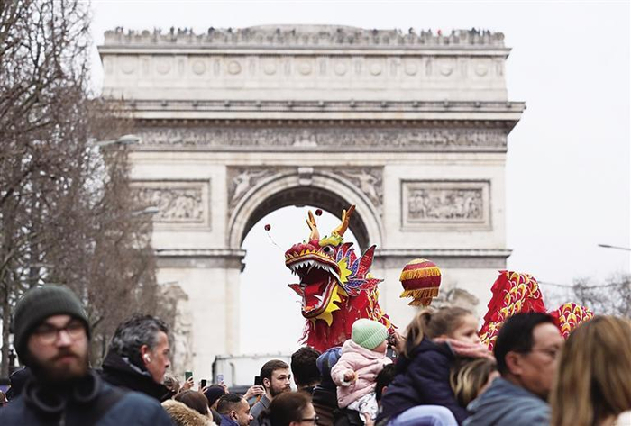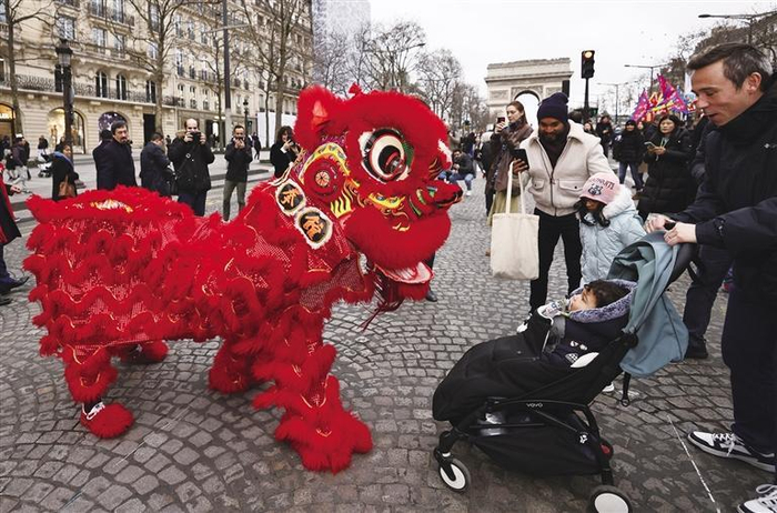 2月4日,人们在法国巴黎香榭丽舍大街观看舞龙舞狮表演。法国华人社区4日在巴黎香榭丽舍大街主办舞龙舞狮等表演活动,庆祝即将到来的龙年春节。 新华社记者 高静 摄
