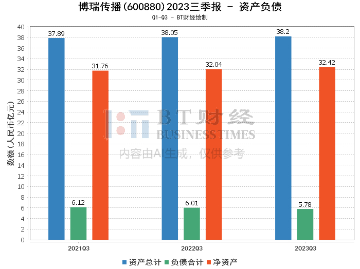 在资产负债方面,博瑞传播2023年三季报显示,公司总资产为38.2亿元,相比上年度末的38.62亿元略有下降。负债合计为5.78亿元,较上年度末的6.57亿元减少,显示出公司在财务管理上的稳健。净资产则实现了小幅增长,从上年度末的32.06亿元增至32.42亿元。值得注意的是,资产负债率从上年度末的17%降至15.13%,反映出公司财务结构的进一步优化。
