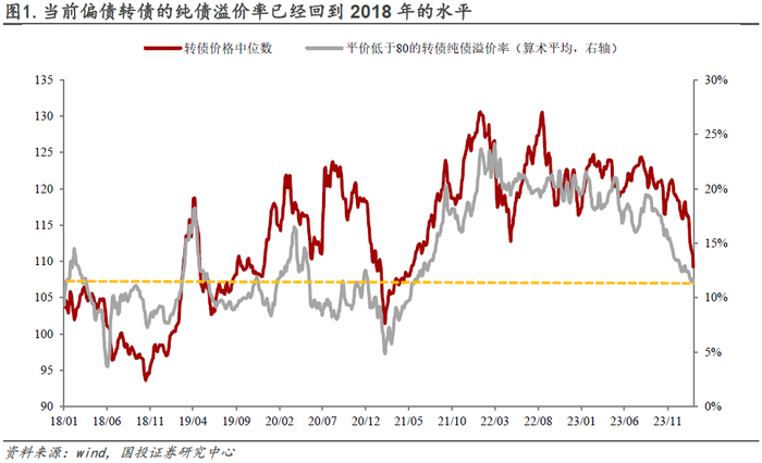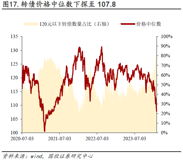 就绝对价位来看,当前可转债收盘价中位数为107.8,处于20年以来的5.1%分位数水平。绝对价位在120元以下的转债数量占比已提升至90%。由于对应正股跌幅过快,当前纯债/转股溢价率整体并不低,低价转债数量虽然大幅增加,但是当前市场价格低于120元、转股溢价率低于30%的标的数量有限,真正符合双低标准的标的仍然较少。