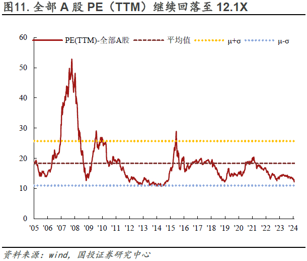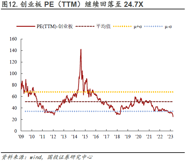 指数估值继续回落。全部A股PE(TTM)为12.1X,比上上周回落0.9X,处于2005年以来历史估值水平的8.9%分位数,全市场估值继续回落。创业板PE(TTM)由此前的28.07X进一步回落至24.7X,处于2009年以来历史估值水平的0.1%分位数,创业板估值继续创新低。