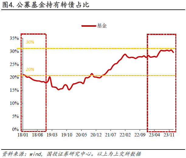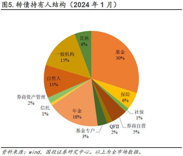 截至2018年年末转债规模仅不到2000亿,尚且是“小众资产”,根据上交所披露的数据彼时基金直接持有占比不到20%,大股东尚且是转债持有的主力人群;而截至今年1月末转债市场规模超过9000亿、比2018年翻4倍,基金直接持有转债占比也来到30%,年金持有转债占比20%,机构投资者转债持有占比整体在75%以上。