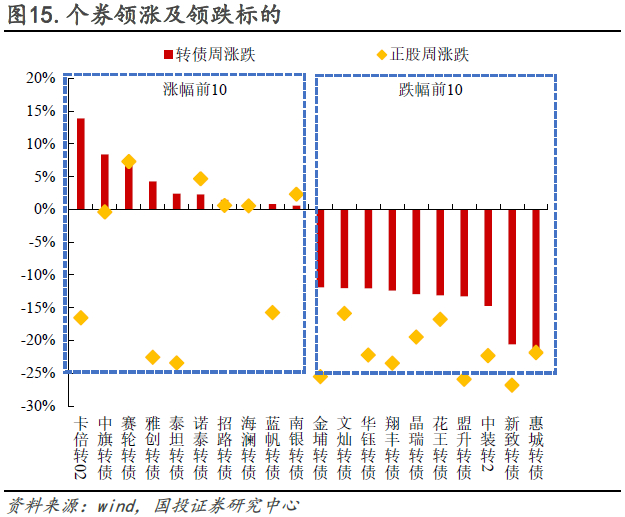 个券方面,上周卡倍转02(13.89%)、中旗(8.41%)、赛轮(787%)涨幅靠前,分属汽车、建筑材料、汽车板块,卡倍转02为新券上市,中旗、雅创、泰坦、蓝帆则有一定炒作性质,其余表现与正股基本相当;惠城(-22.02%)、新致(-20.61%)、中装转2(-14.74%)领跌,分别属于环保、计算机、建筑装饰板块,转债在估值支撑下跌幅已经小于对应正股。