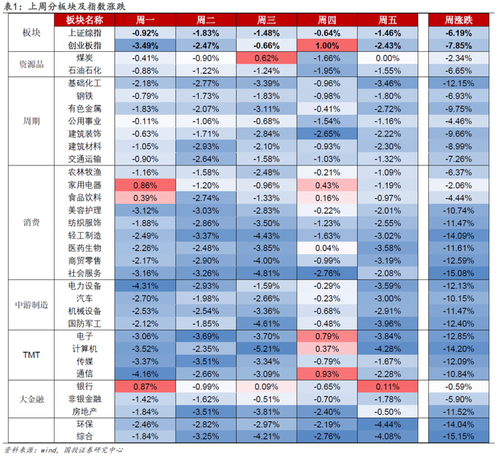 上周上证综指、创业板指分别下跌6.19%、7.85%,在市场连续调整过程中雪球产品、两融等都成为加剧调整的助推器,市场出现显著流动性冲击,其中中小创的表现远弱于大盘。行业方面,上周各个板块均下跌、仅有4个板块跌幅在5%以内、15个板块跌幅超10%,其中银行、家用电器、食品饮板块跌幅相对较小,除基础化工外的顺周期跌幅相对较小,TMT/大制造则跌幅较大,社会服务、计算机、轻工制造板块领跌。